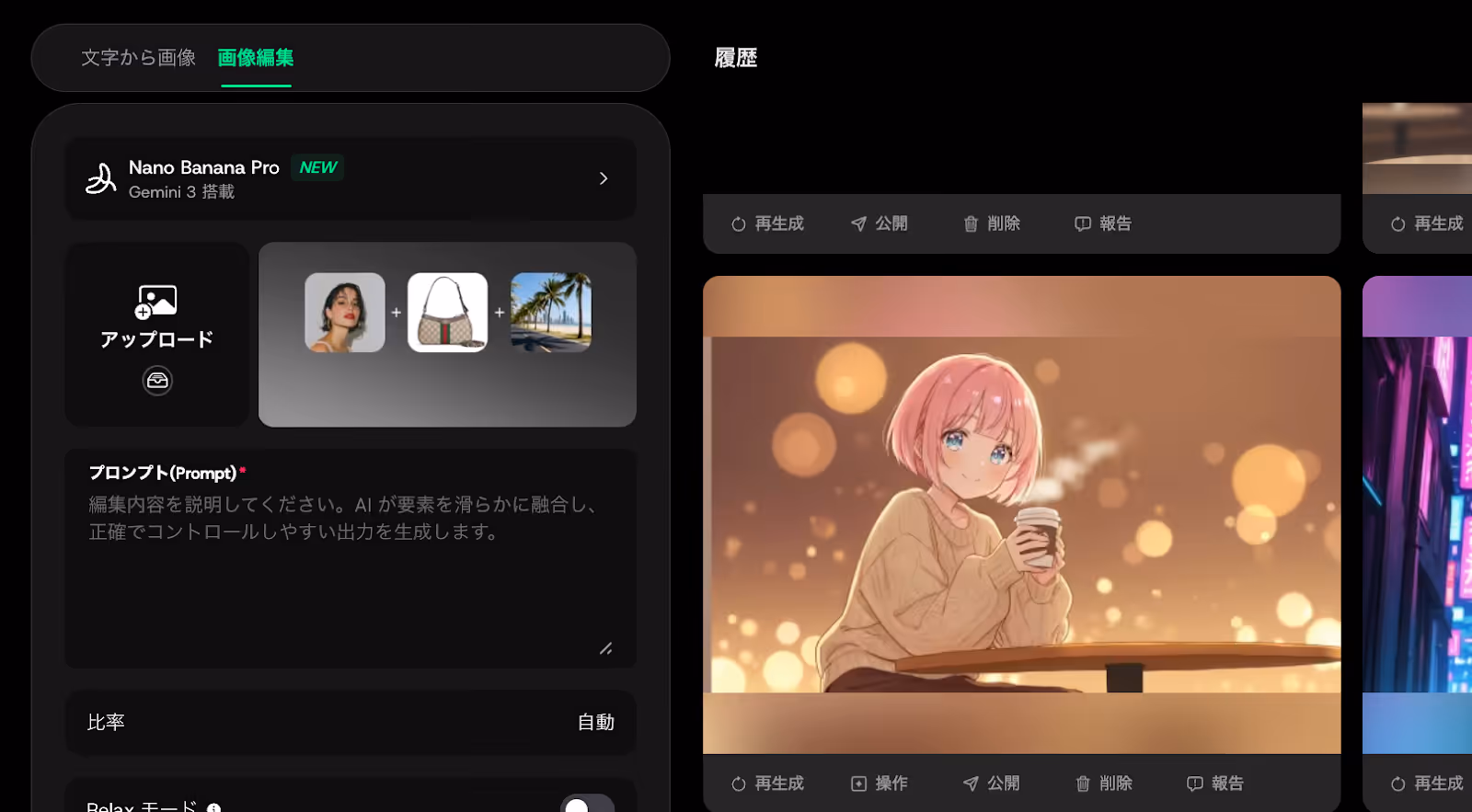 この使い方はシンプルです。「文字から画像」タブの隣にある「画像から編集」をクリックし、NanoBanana Proのモデルを選択します。