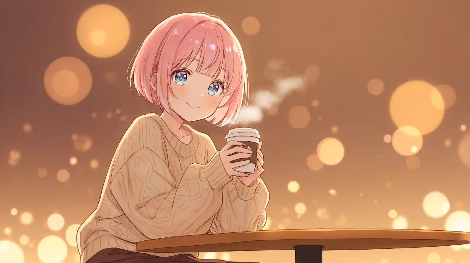 wearing beige knit sweater and long skirt, sitting at a cafe table, holding a coffee cup with both hands,