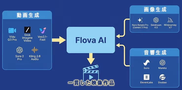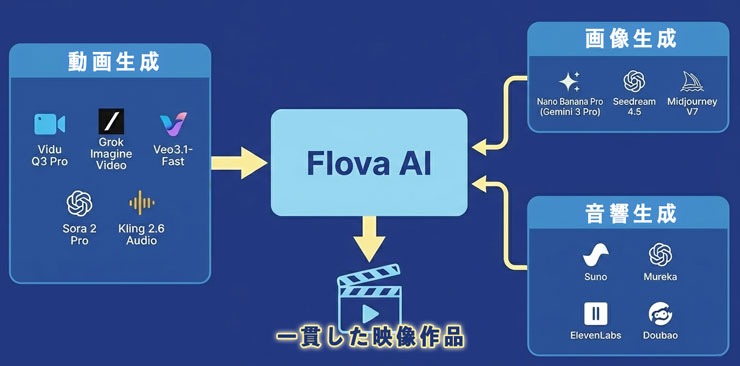 Flova AIは、動画や画像、音楽など用途の異なる複数の生成AIモデルを裏側で連携・統合し、単一の制作フローの中で使い分けられる“制作プラットフォーム”として設計されています。