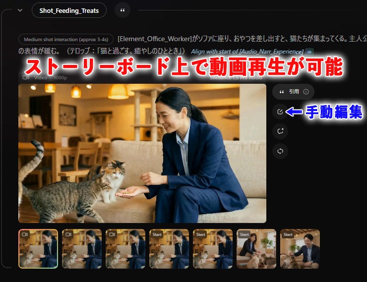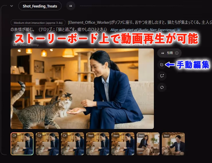 各カットは数秒程度の動画として生成されるため、内容を確認しながら、メッセージ入力欄で修正指示を出したり、“手動編集アイコン”を選択して動画を調整することができます。
