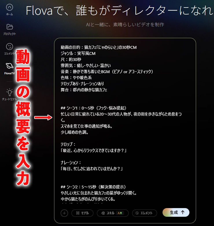 ここからは、実際にFlova AI(フローバエーアイ)を使って映像制作をおこなってみたいと思います。