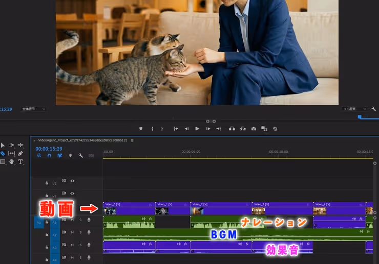 生成が完了すると、映像・BGM・ナレーション(または効果音)がレイヤーごとに分かれた状態でタイムライン上に表示されます。