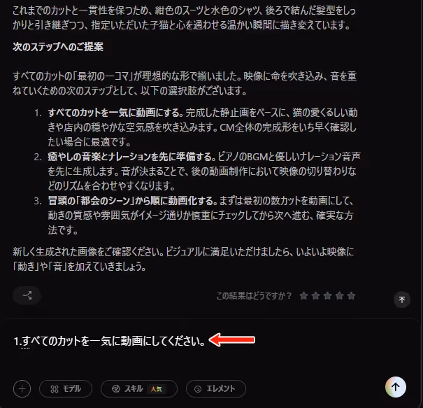 それぞれのカット(画像)を確認して、問題がないようであれば動画化するように指示します(その他の指示も可能です)。