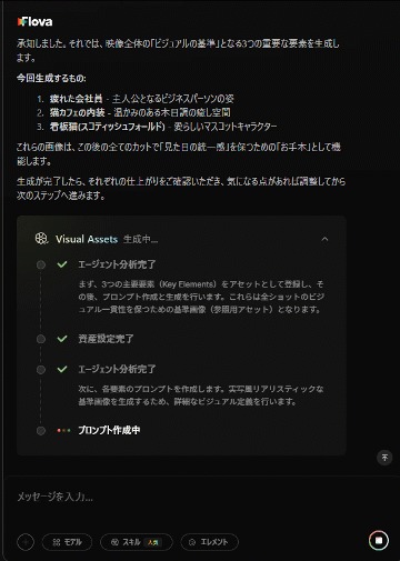 このような話し言葉で要望を伝えるだけで、Flova AIが裏側で最適なプロンプトへと変換し、各種生成モデルに指示を出してくれます。