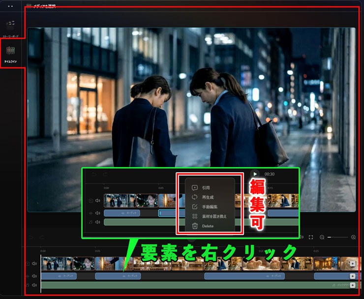 タイムライン上の各要素を右クリックすると編集メニューが表示されるため、必要な箇所を修正します。