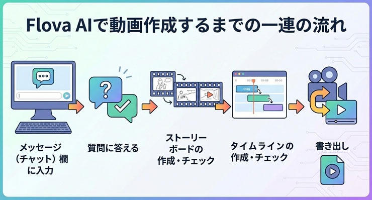 Flova AIは、チャット形式の制作フローにより、「目的」「ターゲット」「雰囲気」といった要件を言語化しながら、ストーリーボード作成からタイムライン編集、書き出しまでをひとつの“プロジェクト”として積み上げて制作することができます。