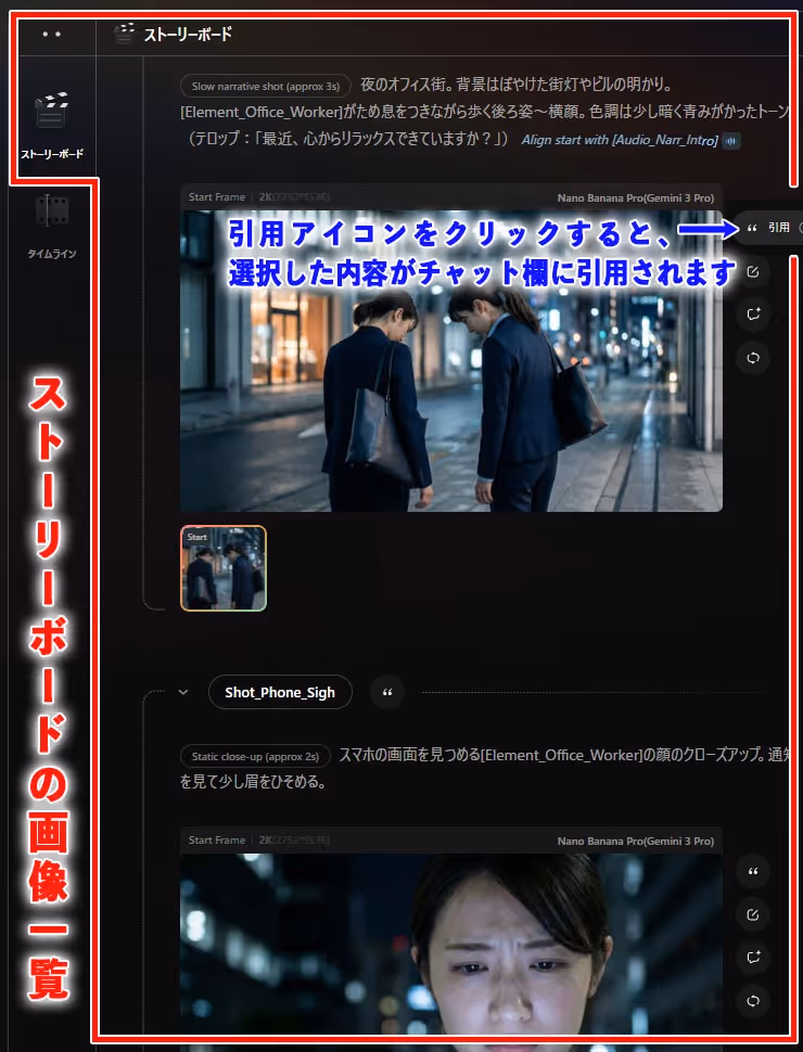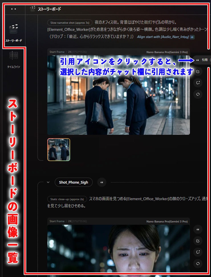 一通りの画像生成が完了すると、生成された各カットがストーリーボード上に一覧で表示されます。