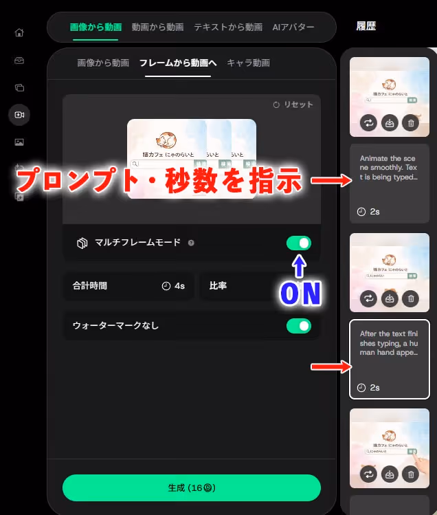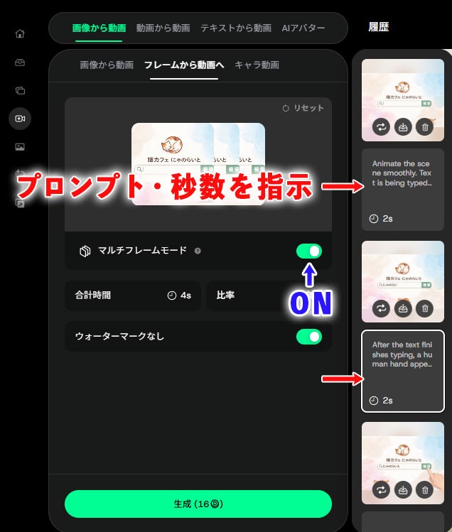今回は、「画像A →(2秒)→ 画像B →(2秒)→ 画像C」とし、それぞれの区間に対応するプロンプトを入力しました。