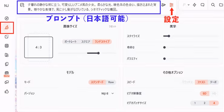 プロンプト(指示内容)を入力したうえで、設定アイコンから画像サイズ、モデル、美学(Aesthetics)、その他のオプションを必要に応じて調整します。
