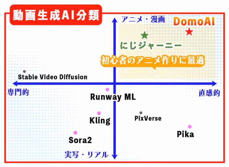SoraやRunway、Klingがリアル映像や幻想的な映像表現を得意とするのに対し、にじジャーニーは漫画やアニ風の表現に強みがあります。