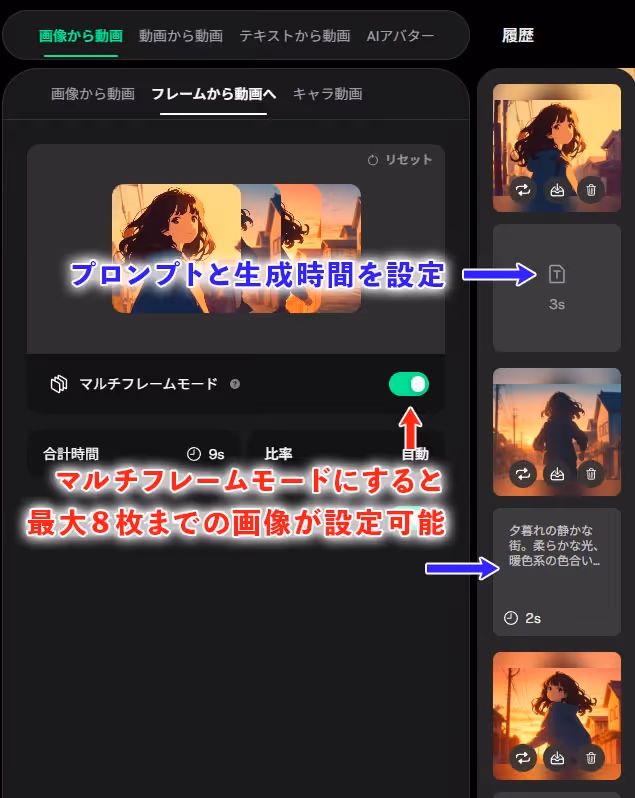 このモードでは、最大8枚の画像を順番に配置し、各フレーム間の区間(A→B、B→C など)ごとに個別のプロンプトを設定できます。