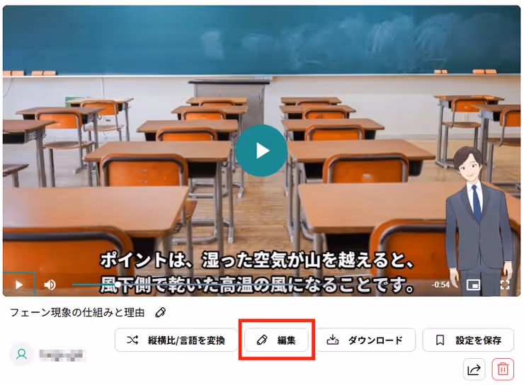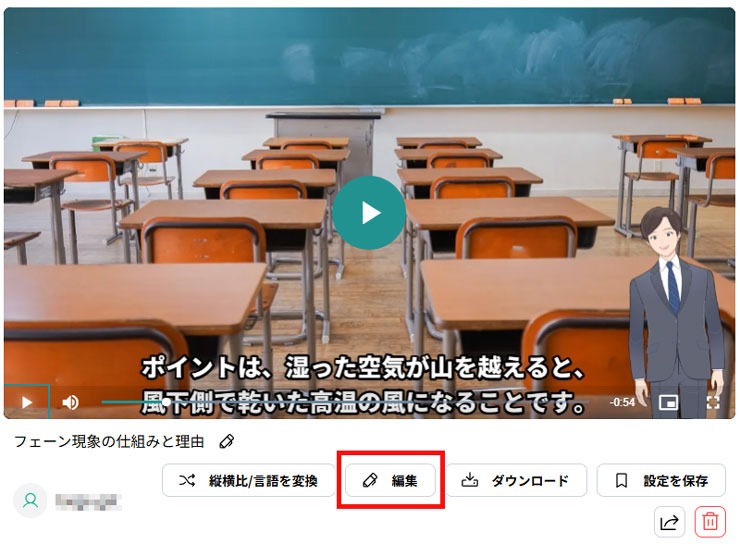 生成された動画はブラウザ上でそのまま再生できるため、内容を確認し、修正したい箇所があれば「編集」ボタンをクリックします。