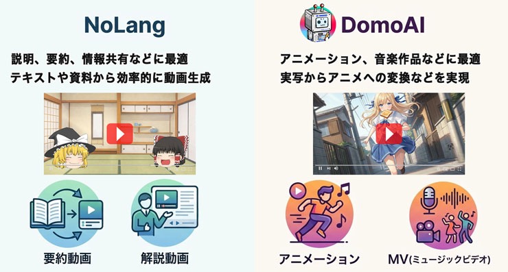 この段落では、“NoLang(ノーラン)”と“DomoAI(ドモエーアイ)”の料金体系・仕組み・商用利用の可否・用途の違いを整理します。
