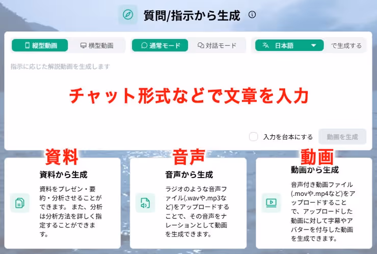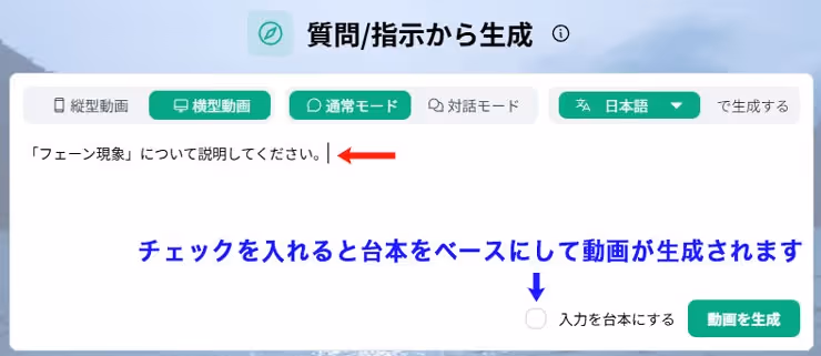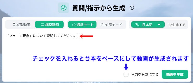 なお、「入力を台本にする」のチェックボックスにチェックを入れると、入力したテキストをベースに動画が生成されます。