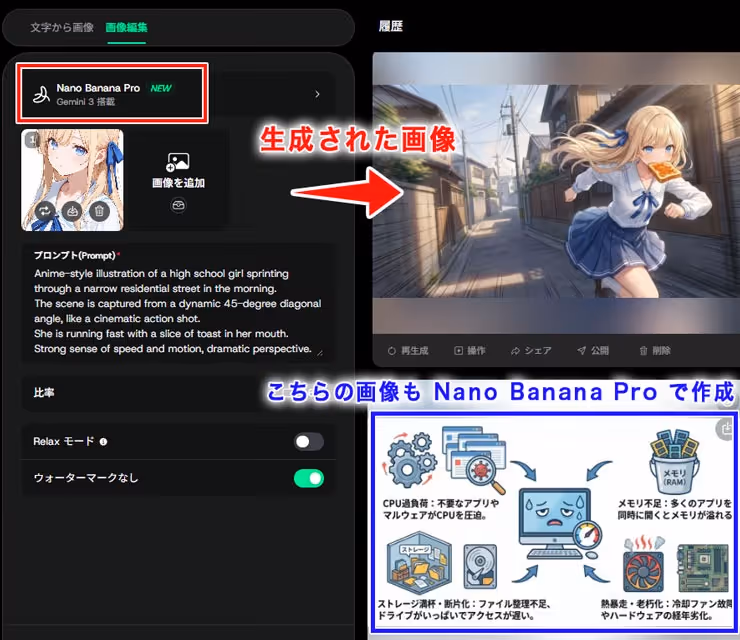 なお、「Nano Banana Pro」は、キャラクター表現や細部の描写に優れたモデルで、以前のモデルと比べて日本語テキストの表示や複雑な構図の安定性が向上しています。