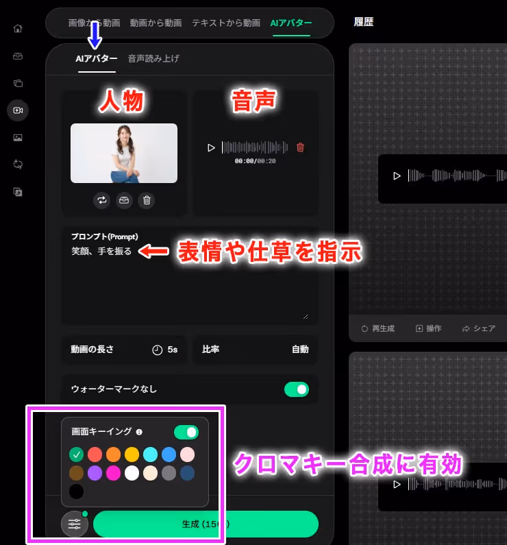 また、AI編集機能を活用して映像を高解像度化したり、Suno AIなどで制作した楽曲にAIアバターを組み合わせ、音声に合わせてキャラクターの口を動かすといった使い方も可能です。