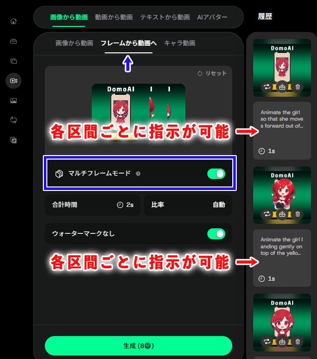 DomoAIの動画生成機能のひとつに、「フレームから動画(Frames to Video)」があります。