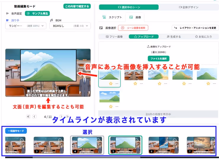 画面下部にタイムラインが表示され、編集したい箇所を選択することで、画像の挿入、アバターの変更、シーンの追加などをおこなうことができます。