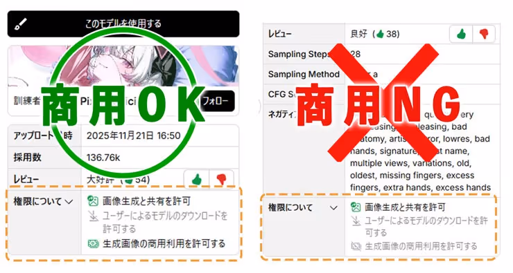 そのため、商用利用を考えている場合は、各モデルの権限欄を確認してから利用しましょう。