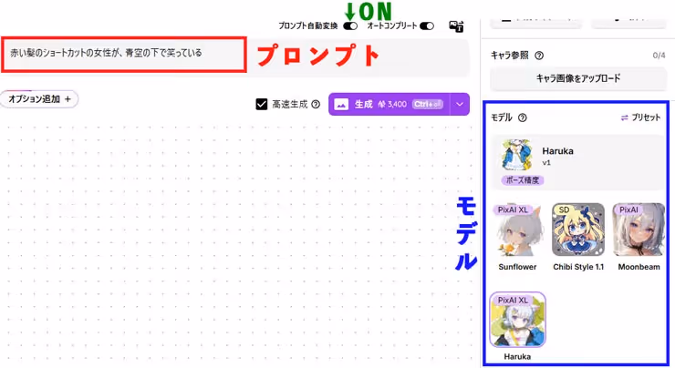 画面中央のプロンプト入力欄に、生成したいイラストの内容をテキストで指示します。