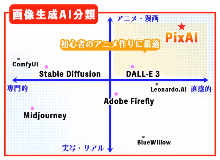 PixAIと関連または競合する主要なサービスについて、機能や用途の観点から簡単に比較・分類し、それぞれがどのような立ち位置にあるのかを整理したのが、下記のマトリクス(表)です。