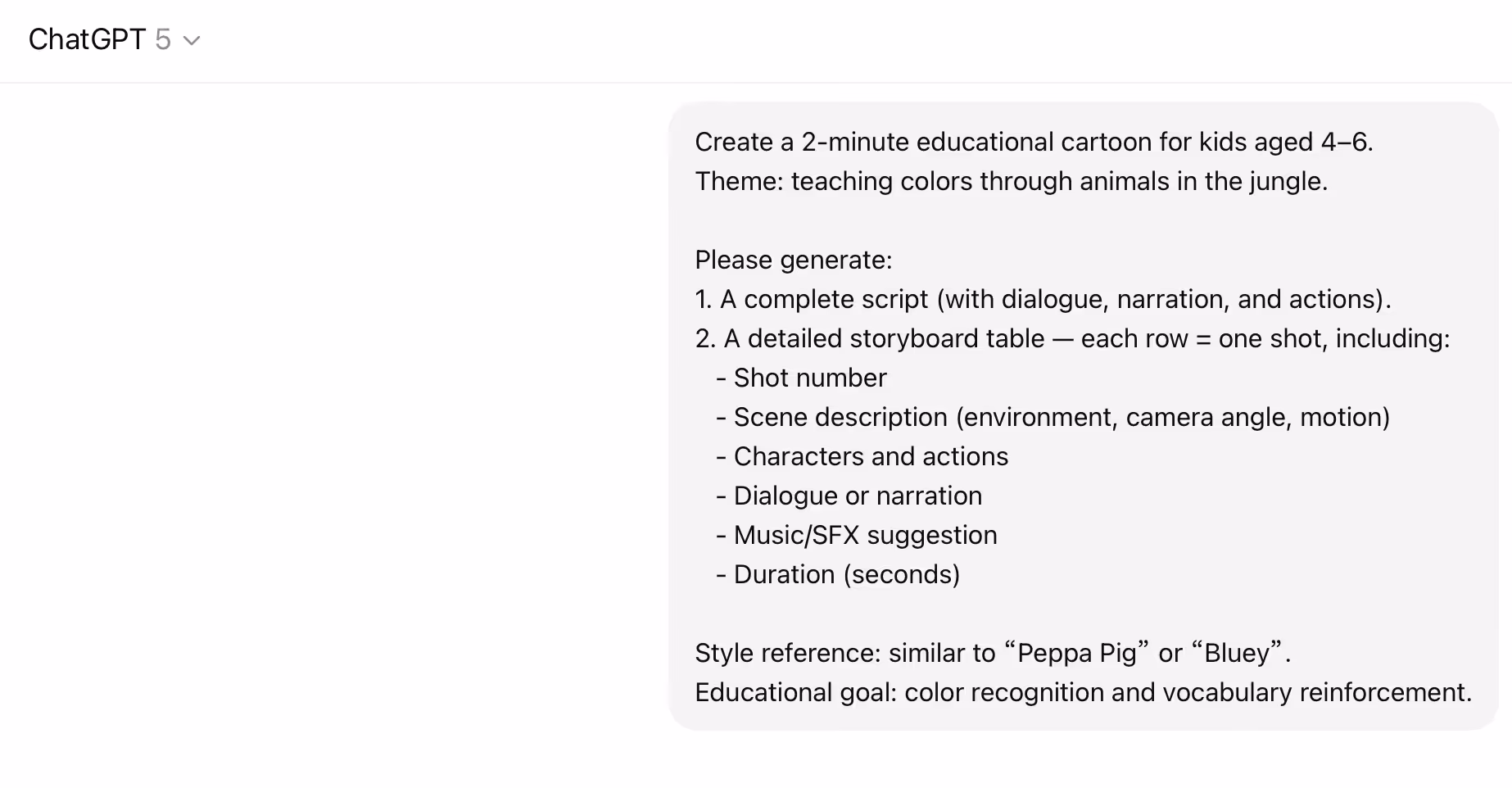 For formatting, I've found that requesting "screenplay format" gives the cleanest results. ChatGPT will structure everything with proper scene headings, action lines, and character names—exactly what you need for the next steps.