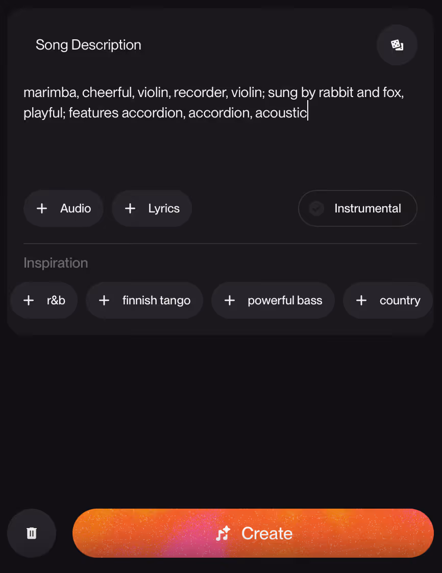 In my shot cartoon, for the end-credits track, with Luna as lead vocalist performing alongside the woodland animals, I used this prompt: “recorder, accordion, whimsical, tender child vocals, marimba, violin, playful, acoustic; featuring accordion.”