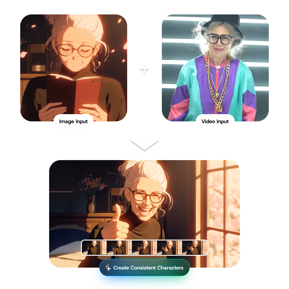 Finally, an AI that remembers your character. Perfect for series, stories, and building your OC. Upload a static character illustration, then animate it with motion from any reference video while maintaining consistent features and clothing.Instantly apply viral anime or cartoon styles to your existing footage.